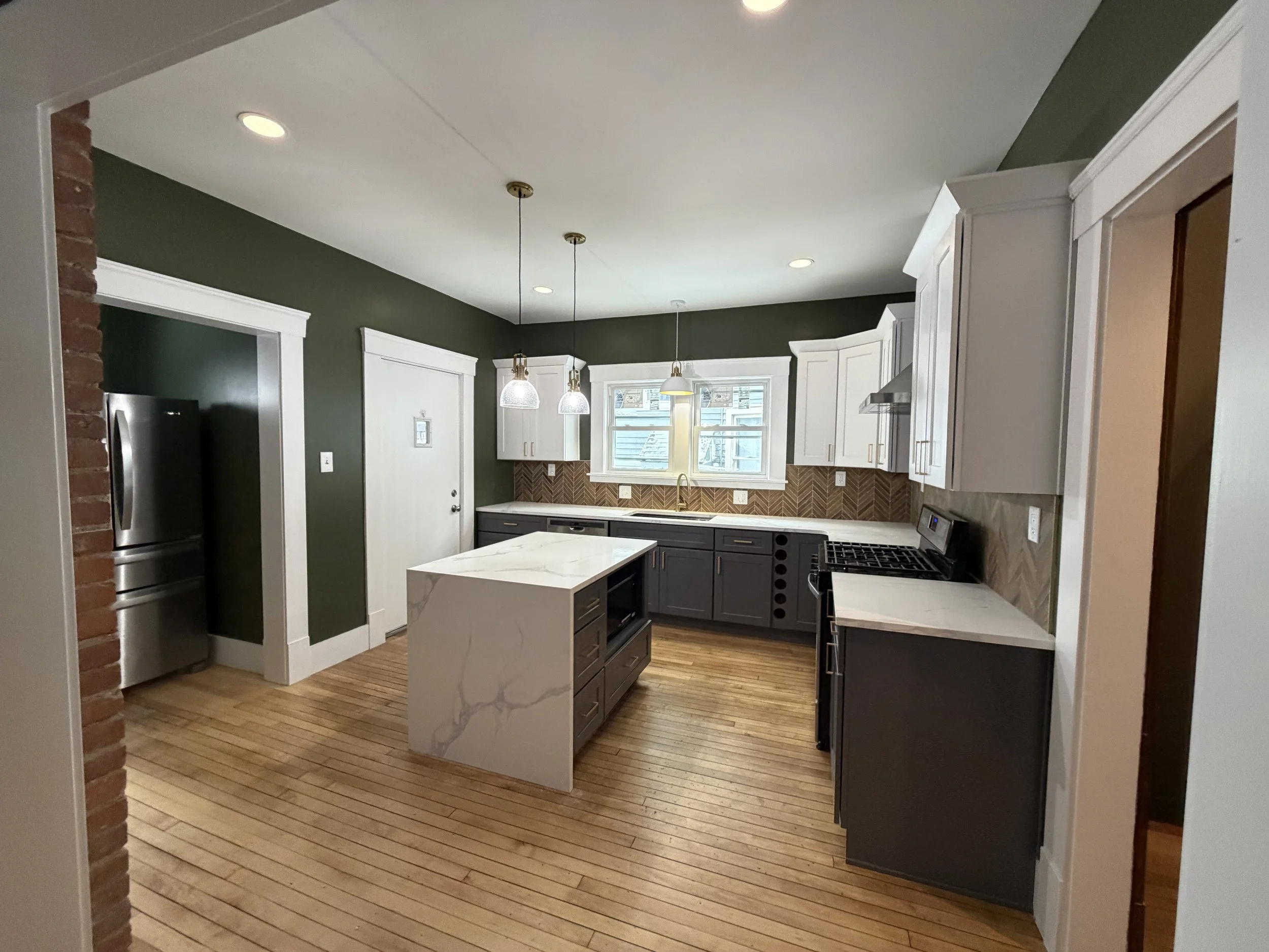 After it was all said and done, the client opted for a porcelain herringbone tile backsplash, gold hardware, a waterfall quartz countertop, birch-faced cabinets, recessed LED lights, and all new fixtures. This project was completed in about two months, well within budget, no major hiccups whatsoever, and all done with the highest standard of craftsmanship that we aim to achieve on every renovation.